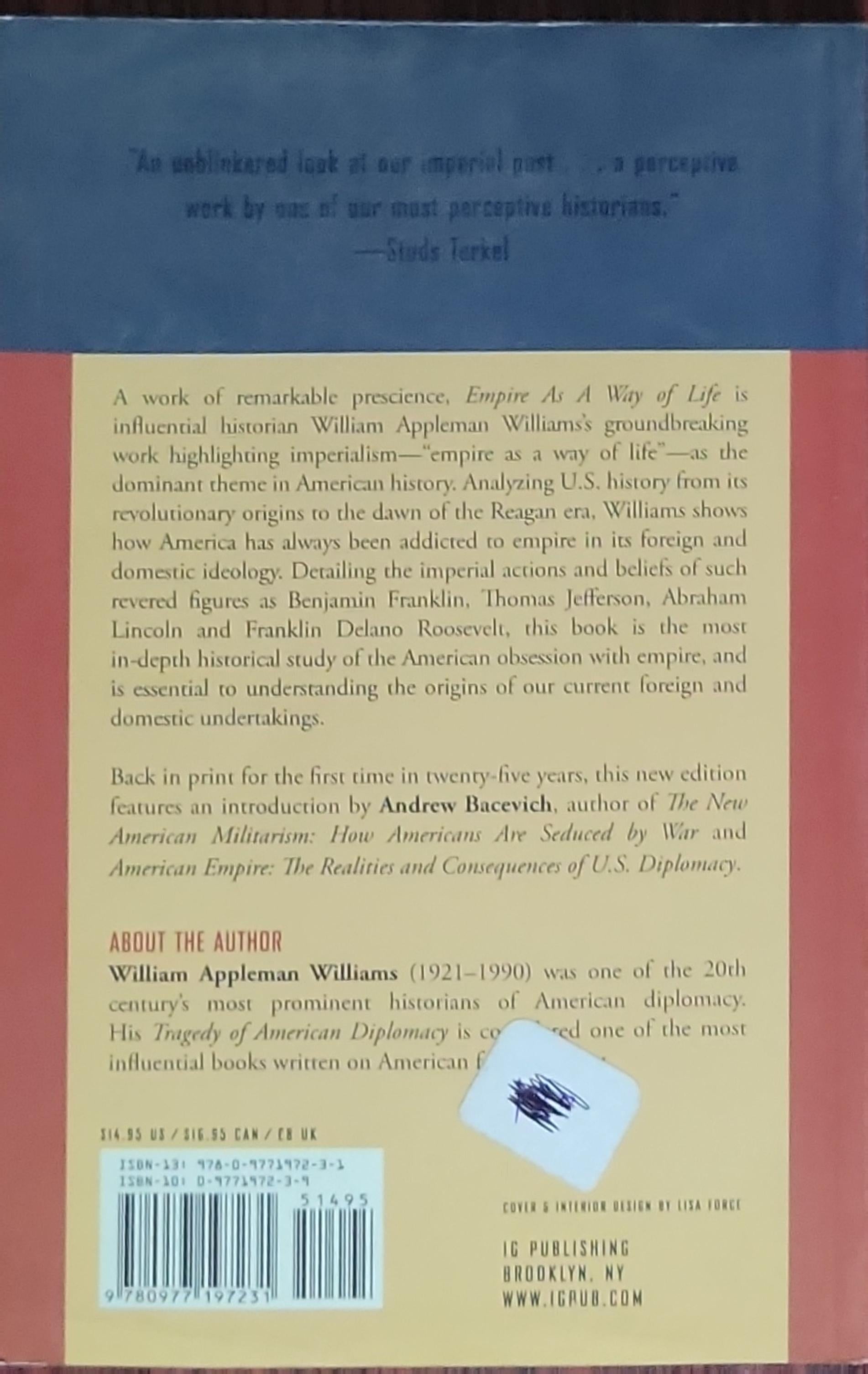 A work of remarkable prescience, Empire As A Way of Life is influential historian William Appleman Williams’s groundbreaking work highlighting imperialism—“empire as a way of life”—as the dominant theme in American history. Analyzing U.S. history from its revolutionary origins to the dawn of the Reagan era, Williams shows how America has always been addicted to empire in its foreign and domestic ideology. Detailing the imperial actions and beliefs of revered figures such as Benjamin Franklin, Thomas Jefferson, Abraham Lincoln and Franklin Delano Roosevelt, this book is the most in-depth historical study of the American obsession with empire, and is essential to understanding the origins of our current foreign and domestic undertakings.