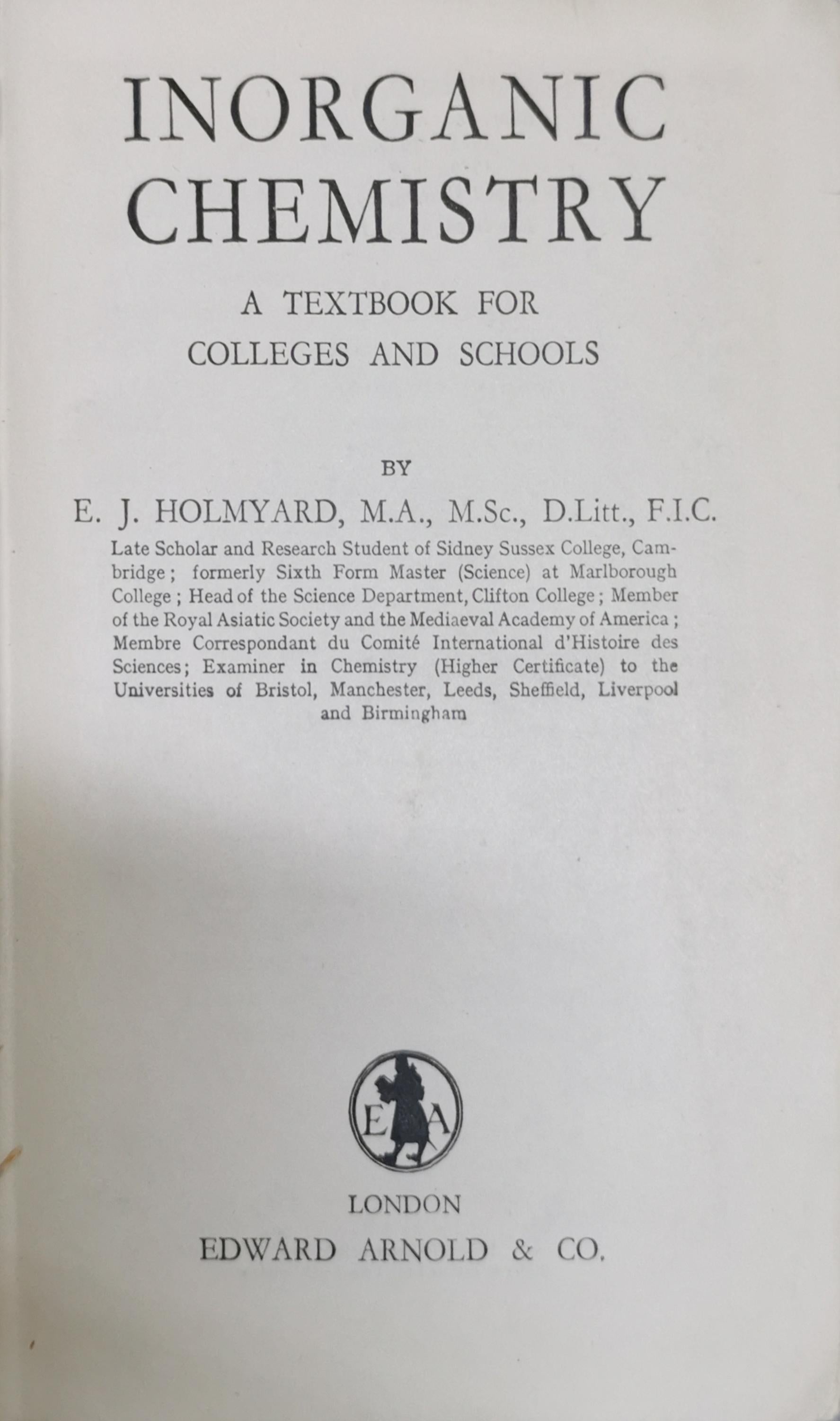 Inorganic Chemistry: A Textbook for Colleges and Schools By E. J. Holmyard