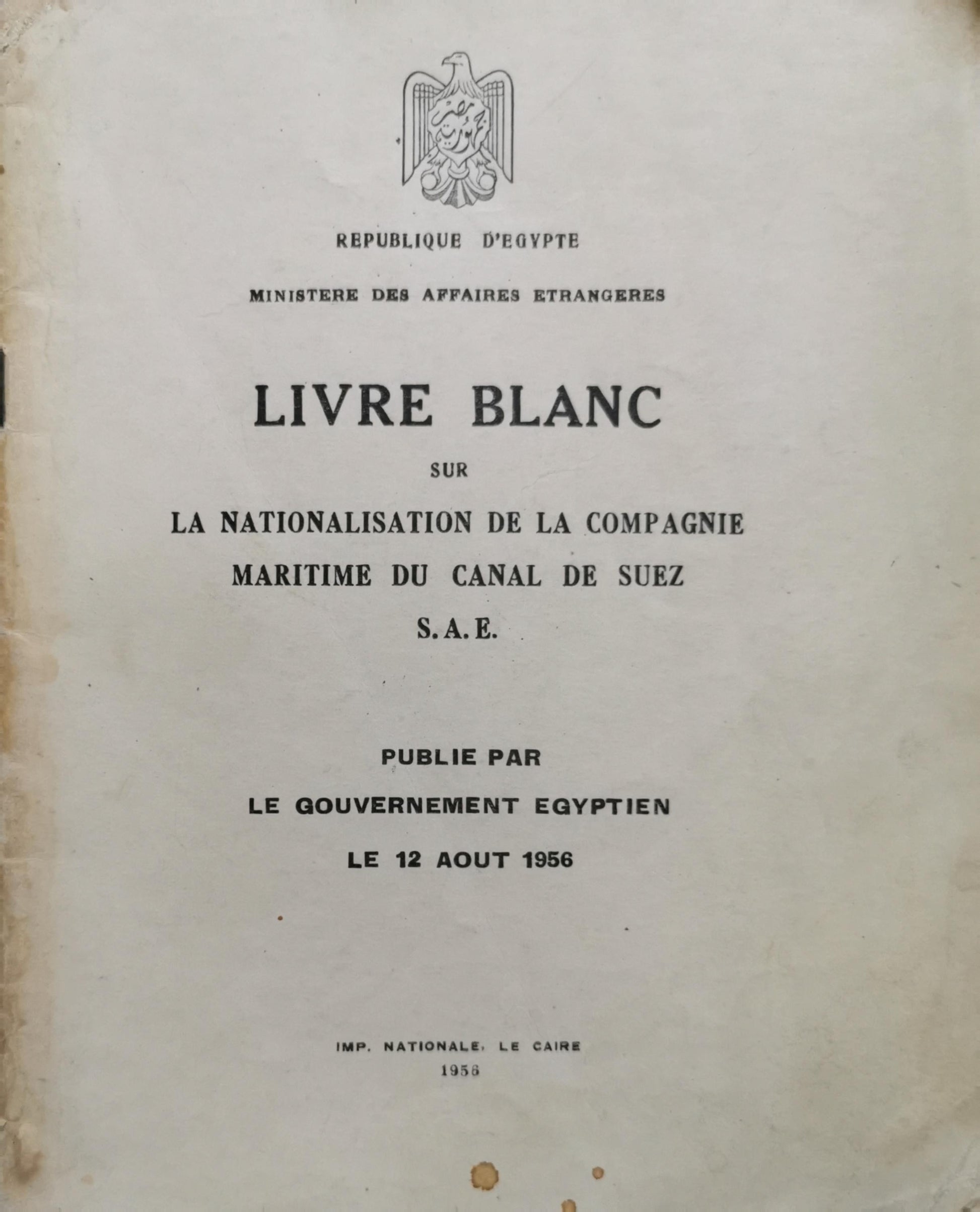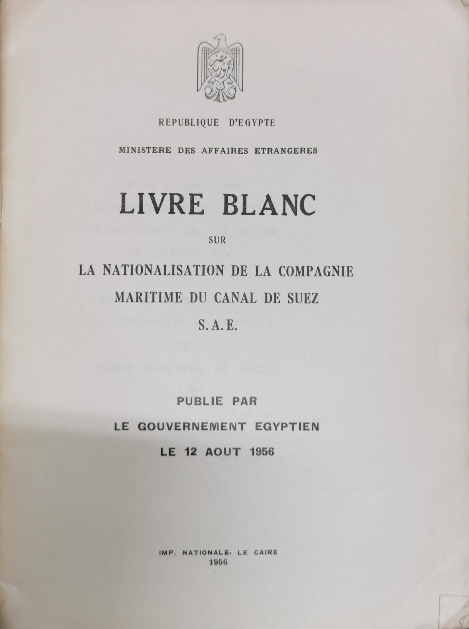 LIVRE BLANC: SUR LA NATIONALISATION DE LA COMPAGNIE MARITIME DU CANAL DE SUEZ S.A.E. By Gouvernement égyptien