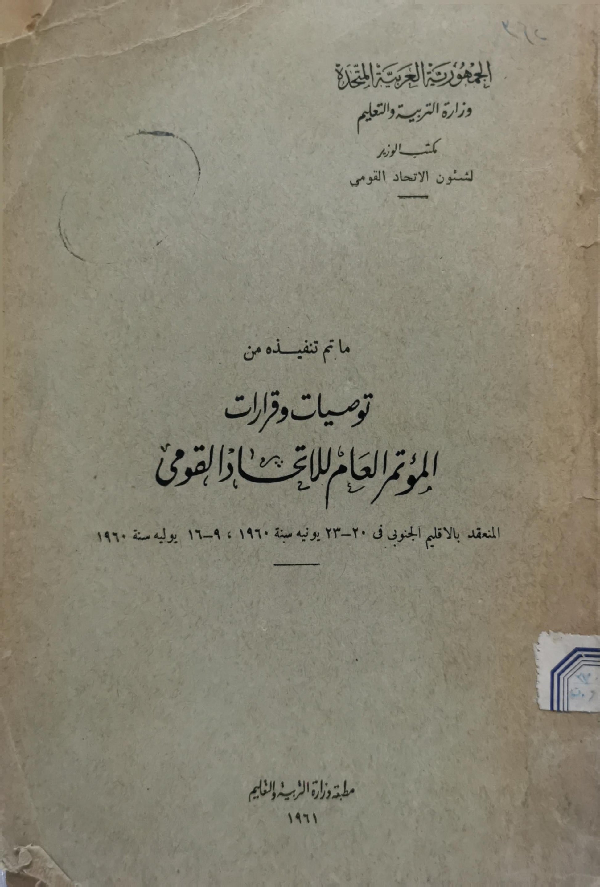 ما تم تنفيذه من توصيات وقرارات المؤتمر العام للاتحاد القومي: المعقد بالإقليم الجنوبي في 20-23 يونية سنة 1960، و9-16 يوليه سنة 1960