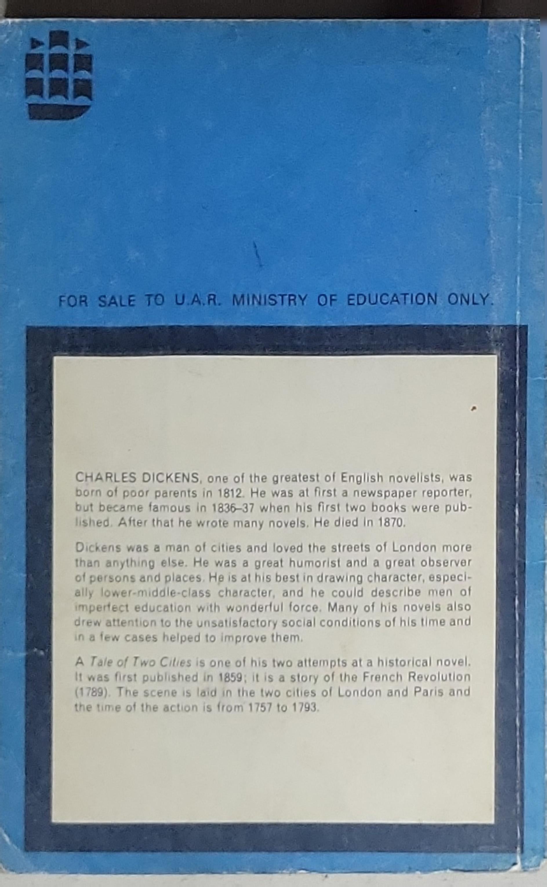 A brief introduction to Charles Dickens and his novel A Tale of Two Cities. The back matter describes Dickens as one of the greatest English novelists, notes his life (born to poor parents, journalist, then famous for his novels, died 1870), and explains that A Tale of Two Cities is one of his two historical novels set around the French Revolution, taking place in London and Paris from 1757 to 1793.