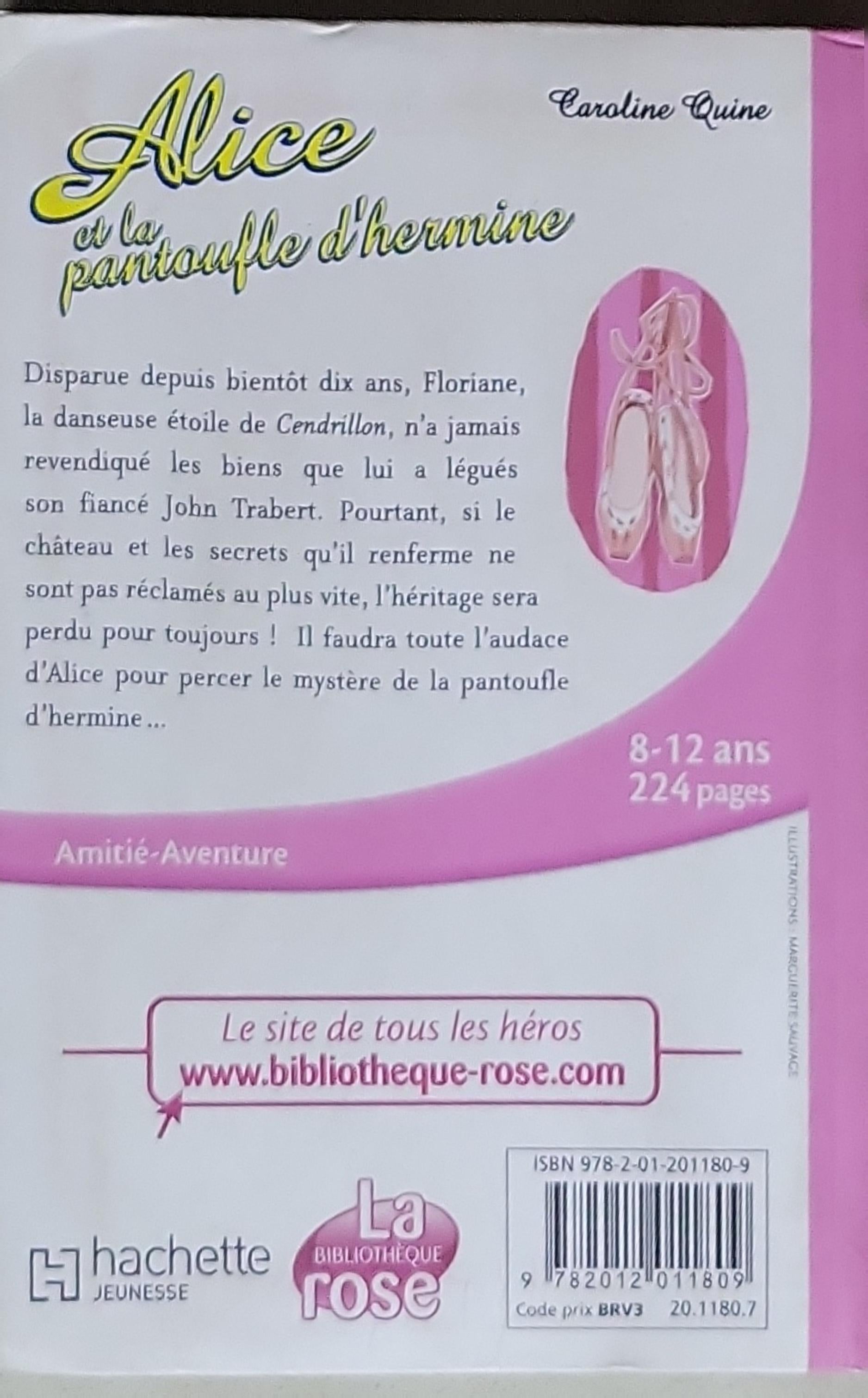 Disparue depuis bientôt dix ans, Floriane, la danseuse étoile de Cendrillon, n'a jamais revendiqué les biens que lui a légués son fiancé John Trabert. Pourtant, si le château et les secrets qu'il renferme ne sont pas réclamés au plus vite, l'héritage sera perdu pour toujours ! Il faudra toute l'audace d'Alice pour percer le mystère de la pantoufle d'hermine...