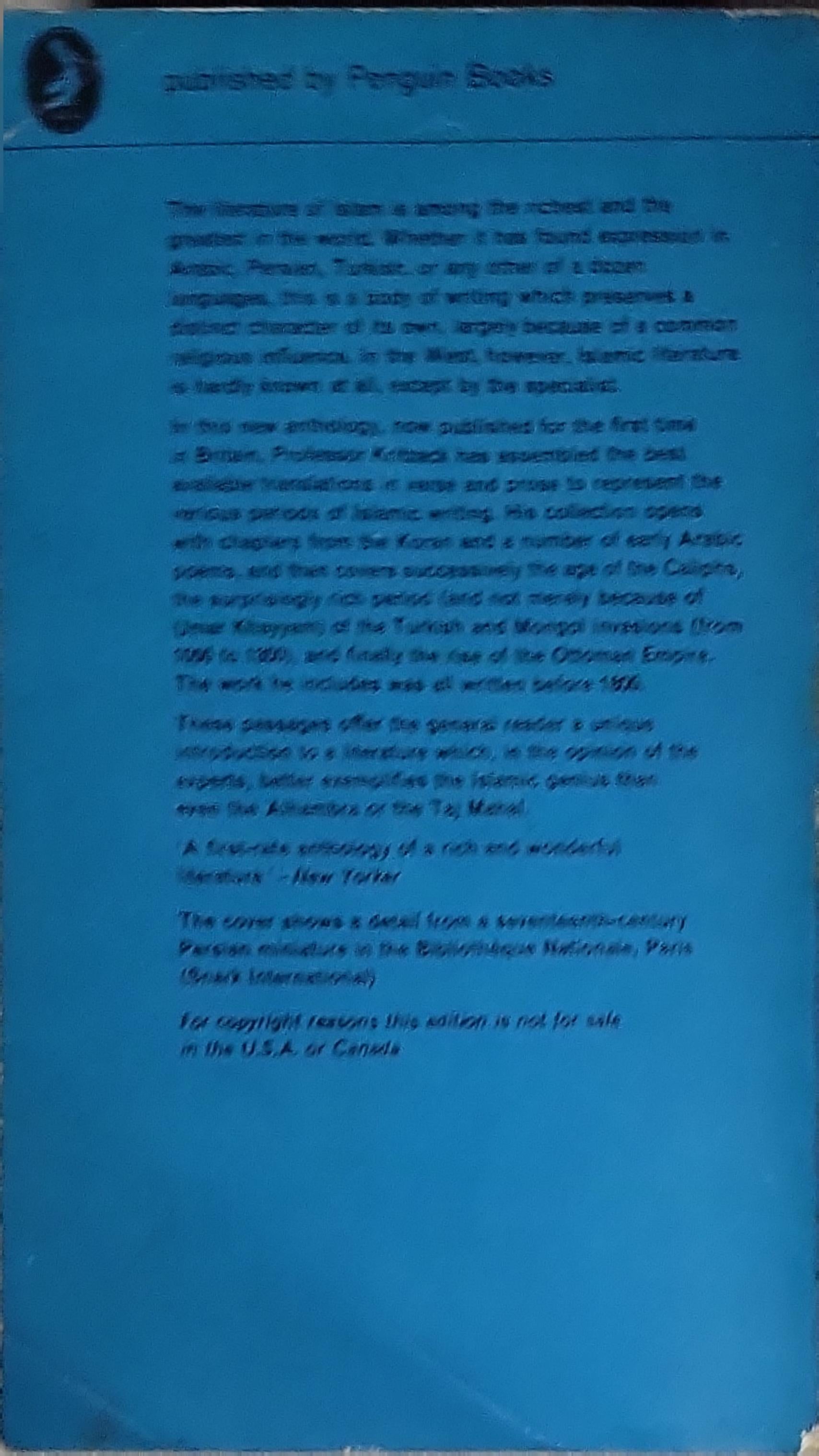 "Anthology of Islamic Literature" edited by James Kritzeck. Pelican Books edition (A Pelican Original) published in 1964. 400 pages.