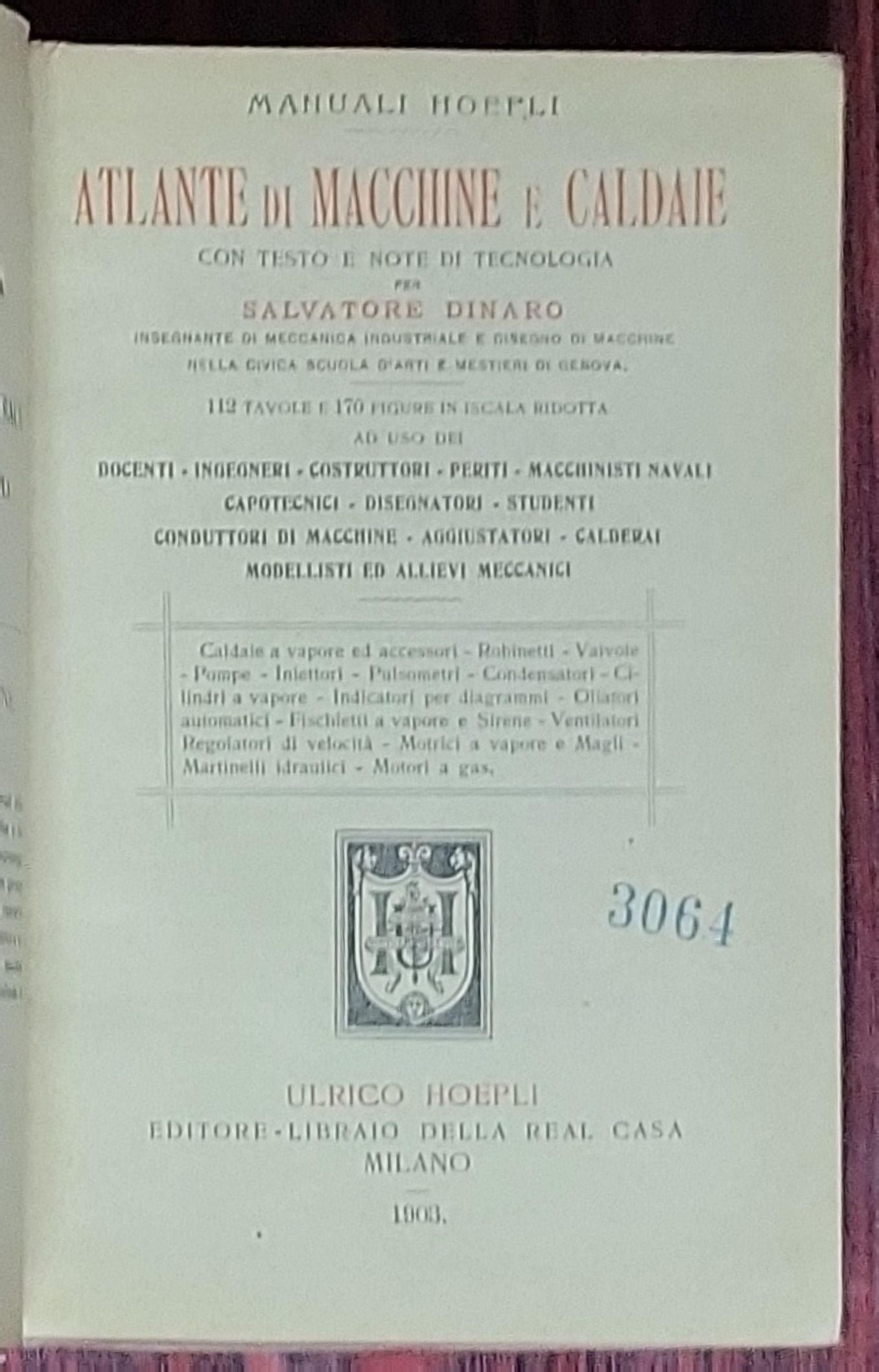 Atlante di Macchine e Caldaie with text and notes on technology for engineers; part of Hoepli's Manuali Hoepli series. First edition is attributed to Salvatore Dinaro (S. Dinaro).