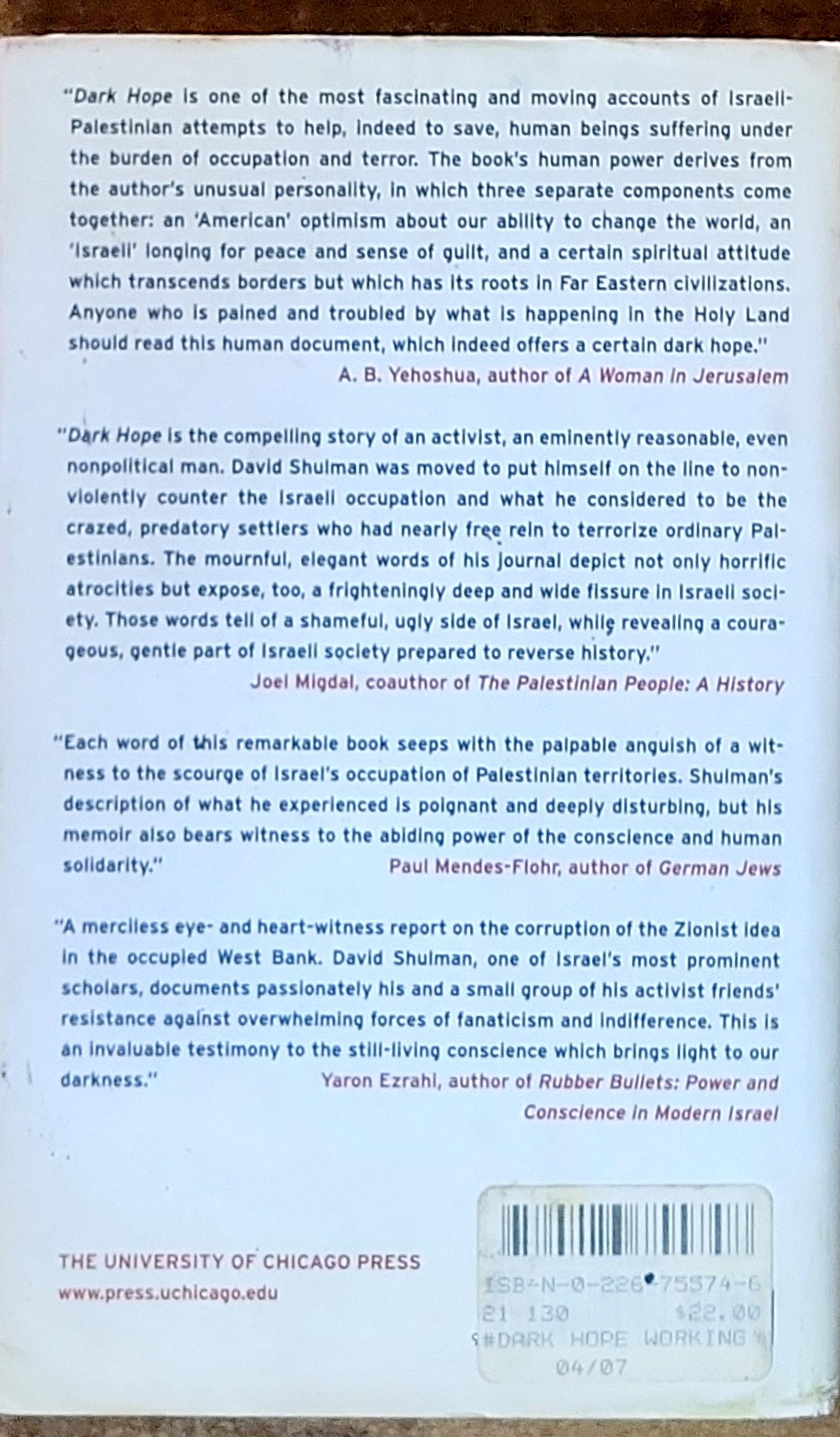 For decades, we've been shocked by images of violent clashes between Israelis and Palestinians in the West Bank and Gaza. But for all their power, those images leave us at a loss: from our vantage at home, it's hard for us to imagine the struggles of those living in the midst of the fighting. Now, American - born Israeli David Shulman takes us right into the heart of the conflict with Dark Hope, an eye - opening chronicle of his work as a member of the peace group Ta'ayush, which takes its name from the Arabic for ''living together.'' With Dark Hope, Shulman has written a book of deep moral searching, an attempt to discover how his beloved Israel went wrong - - and how, through acts of compassionate disobedience, it might still be brought back.