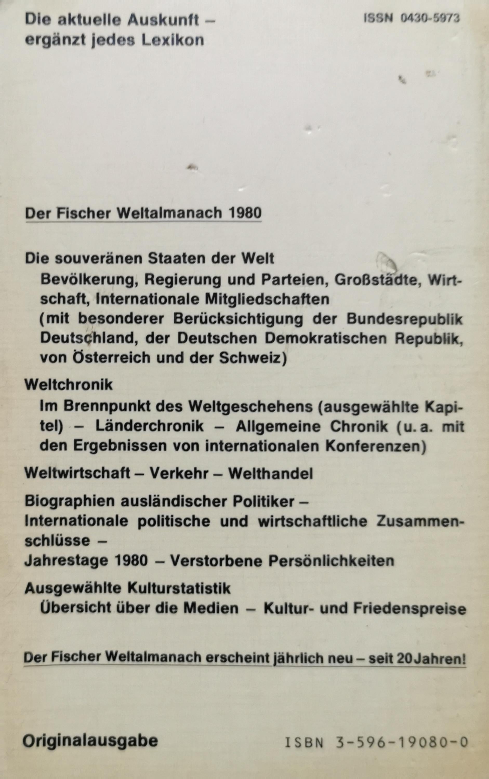 Der Fischer Weltalmanach 1980, herausgegeben von Gustav Fochler-Hauke, bietet eine kompakte Übersicht über souveräne Staaten, Weltwirtschaft, Verkehr, Kulturstatistiken, Chroniken und Hintergrundinformationen zum Weltgeschehen des Jahres 1980.