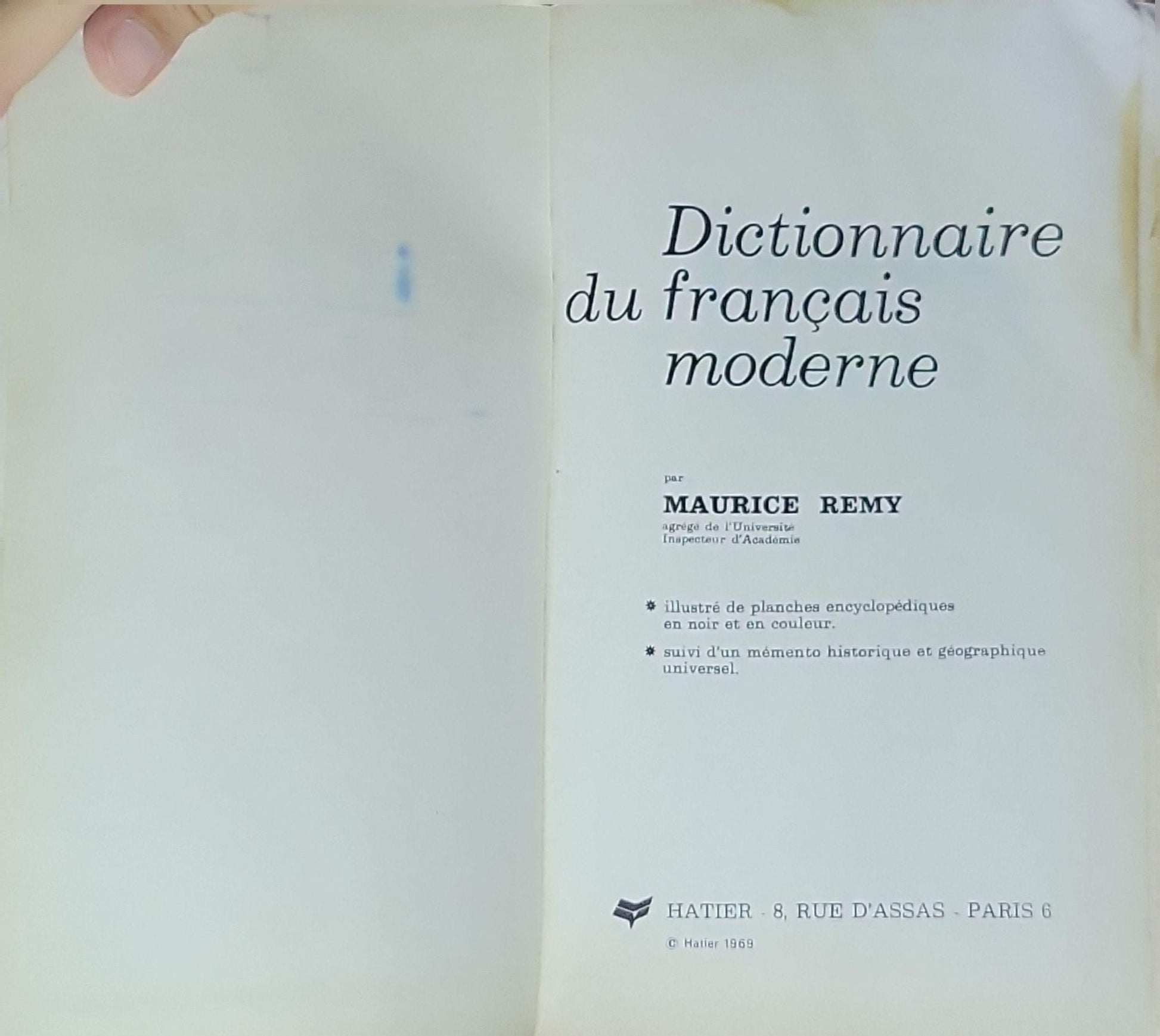 French language dictionary covering modern French; illustrated with encyclopedic plates in black and white and color; includes historical and geographical notes.