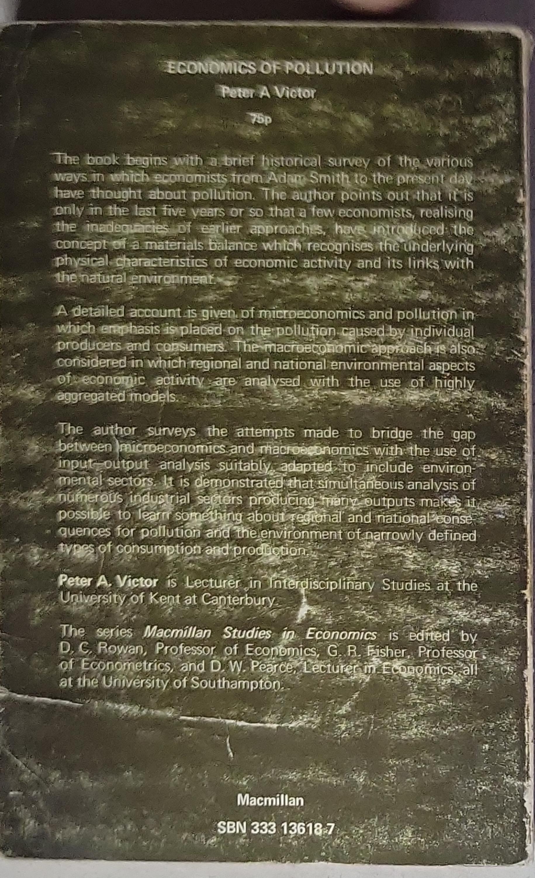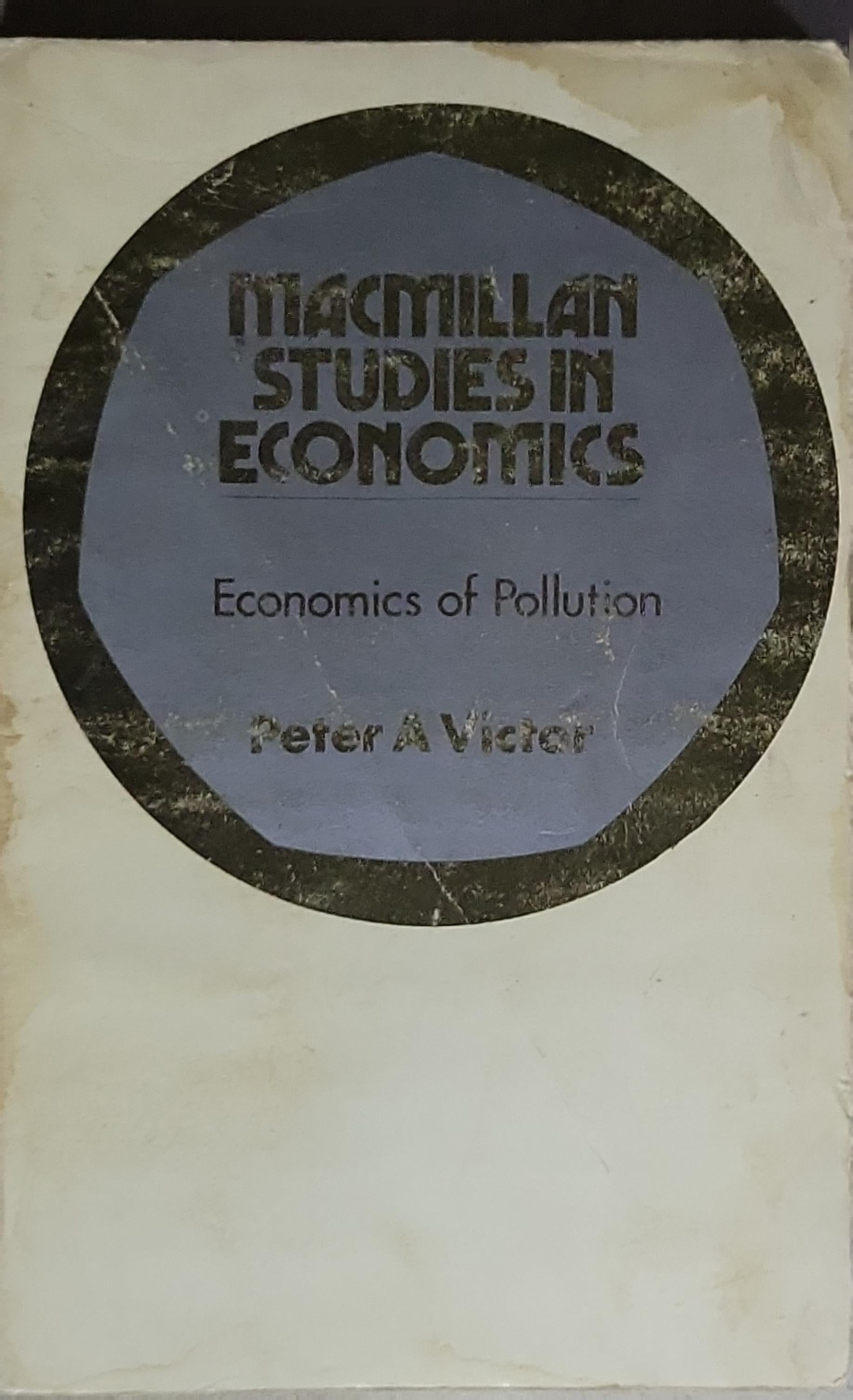 A Macmillan Studies in Economics title by Peter A. Victor. The book opens with a historical survey of how economists have treated pollution, arguing that the last several years have seen notable shifts in approach. It provides a detailed account of microeconomics and pollution, discusses macroeconomic considerations and regional/national aspects of environmental economics using input-output analysis and aggregated models, and aims to bridge the gap between microeconomics and macroeconomics in relation to the environment. It also notes that Peter A. Victor is a lecturer in interdisciplinary studies at the University of Kent at Canterbury, with the Macmillan Studies in Economics series edited by D. C. Rowan, G. R. Fisher, and D. W. Pearce from the University of Southampton.
