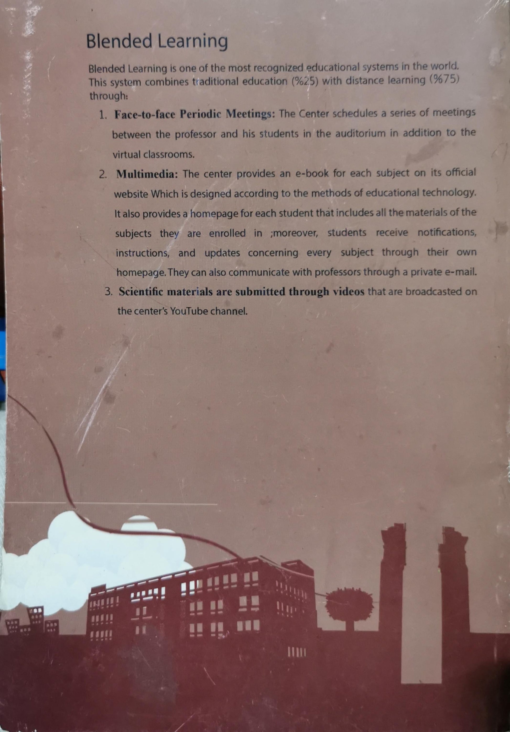 Blended Learning is one of the most recognized educational systems in the world. This system combines traditional education with distance learning through: 1. Face-to-face Periodic Meetings: The Center schedules a series of meetings between the professor and his students in the auditorium in addition to the virtual classrooms. 2. Multimedia: The center provides an e-book for each subject on its official website Which is designed according to the methods of educational technology. It also provides a homepage for each student that includes all the materials of the subjects they are enrolled in; moreover, students receive notifications, instructions, and updates concerning every subject through their own homepage. They can also communicate with professors through a private e-mail. 3. Scientific materials are submitted through videos that are broadcasted on the center’s YouTube channel.
