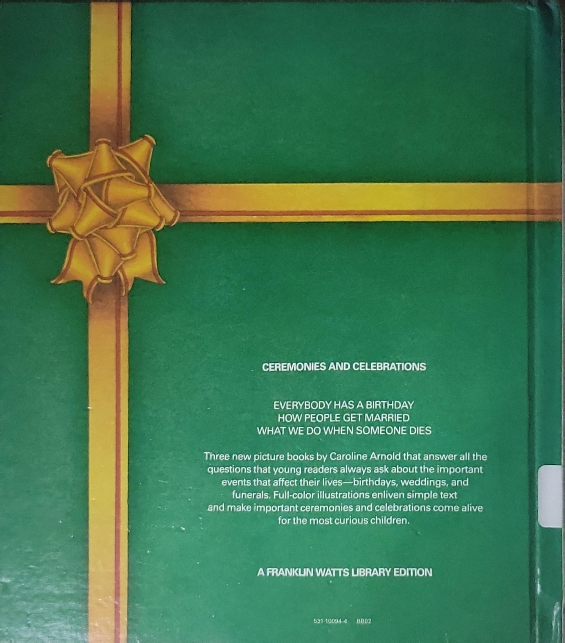 Three new picture books by Caroline Arnold that answer all the questions that young readers always ask about the important events that affect their lives—birthdays, weddings, and funerals. Full-color illustrations enliven simple text and make important ceremonies and celebrations come alive for the most curious children.