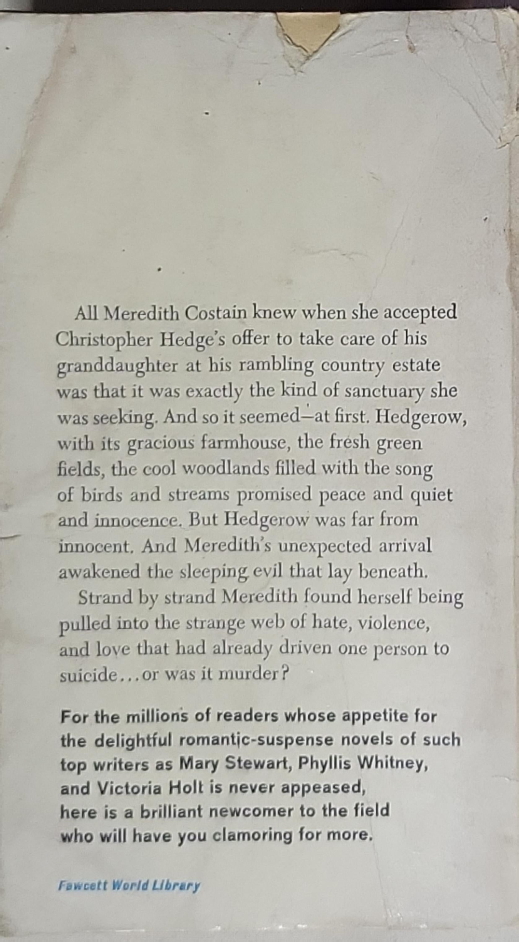 All Meredith Costain knew when she accepted Christopher Hedge’s offer to take care of his granddaughter at his rambling country estate was that it was exactly the kind of sanctuary she was seeking. And so it seemed—at first. Hedgerow, with its gracious farmhouse, the fresh green fields, the cool woodlands filled with the song of birds and streams promised peace and quiet and innocence. But Hedgerow was far from innocent. And Meredith’s unexpected arrival awakened the sleeping evil that lay beneath. Strand by strand Meredith found herself being pulled into the strange web of hate, violence, and love that had already driven one person to suicide… or was it murder? For the millions of readers whose appetite for the delightful romantic-suspense novels of such top writers as Mary Stewart, Phyllis Whitney, and Victoria Holt is never appeased, here is a brilliant newcomer to the field who will have you clamoring for more.