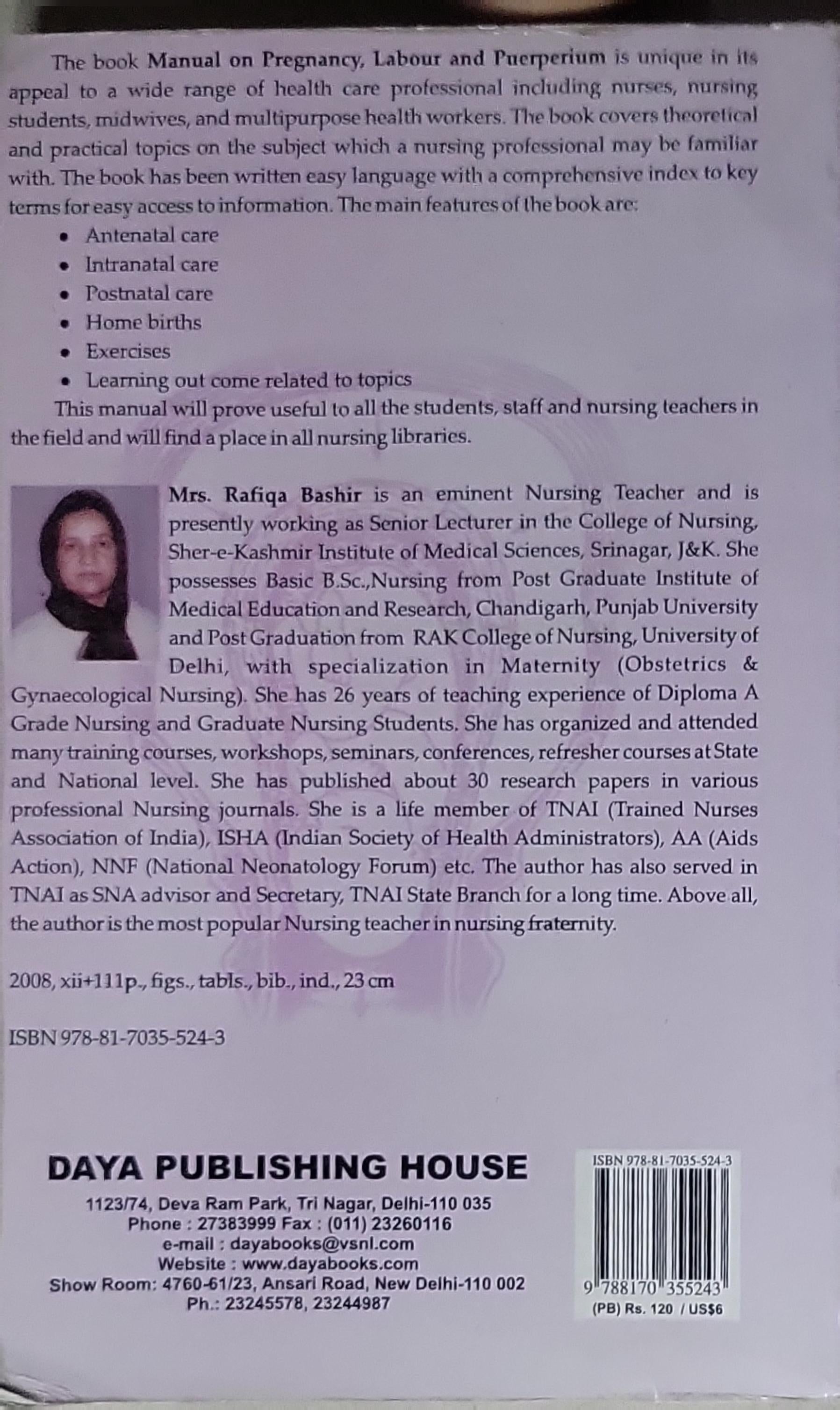 The book Manual on Pregnancy, Labour and Puerperium is authored by Rafiqua Bashir. Published by Daya Publishing House (Dayabooks), the edition shown is from 2008. The back cover notes 2008, xii+111p., figs., tabs., bib., ind., 23 cm with ISBN 978-81-7035-524-3. The work appears to be a nursing/medical text focusing on antenatal, intranatal, and postnatal care, including sections on home births, exercises, and related topics, aimed at nursing students and health professionals.