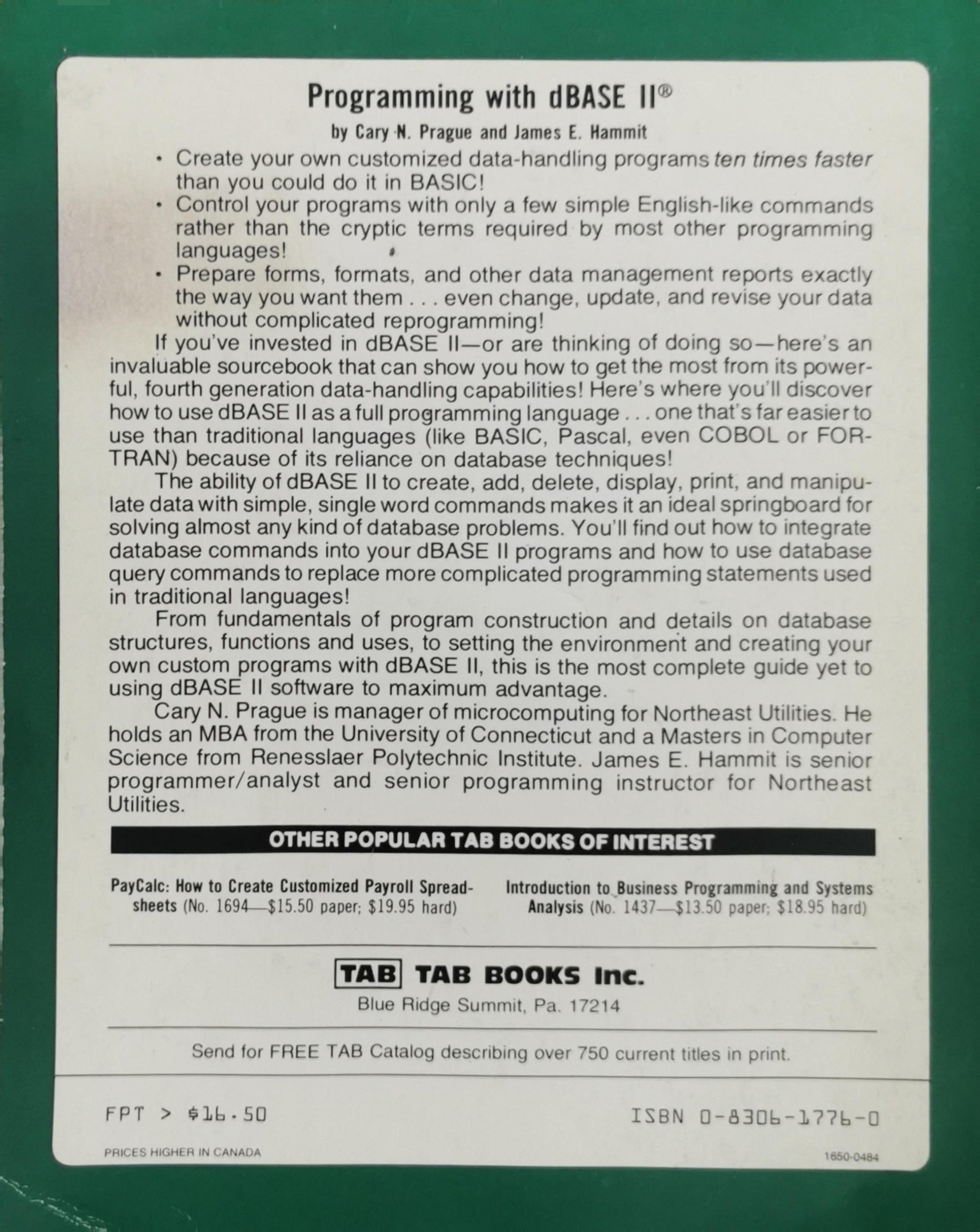 Programming with dBASE II by Cary N. Prague and James E. Hammit, published by TAB Books Inc., Blue Ridge Summit, PA 17214. Includes guidance on using dBASE II and data-handling programs.