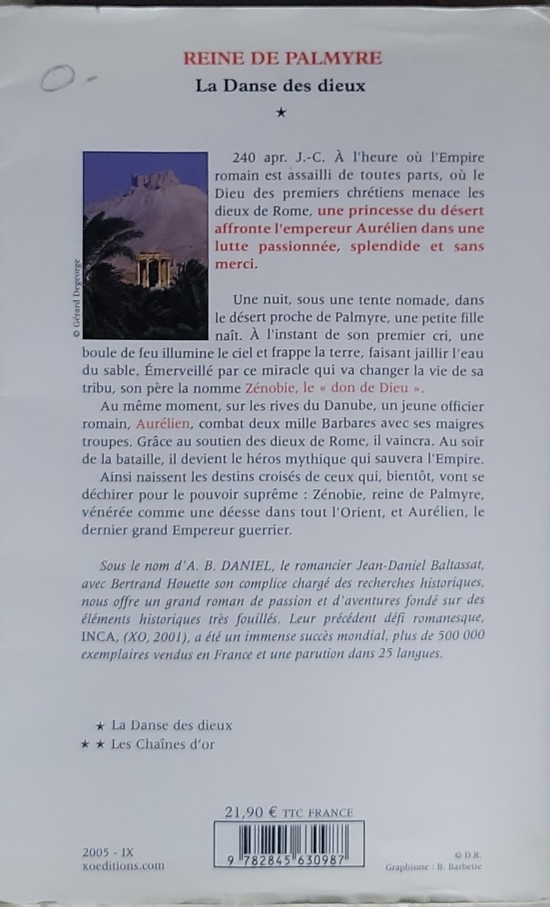 Par amour et par vengeance, une princesse du désert défie l’empire de Rome et affronte l’empereur Aurélien dans une lutte passionnée et spectaculaire. Le roman suit Aurélien et la jeune Zénobie, reine de Palmyre, alors que leurs destins s’entrelacent dans un contexte historique dramatique et héroïque.