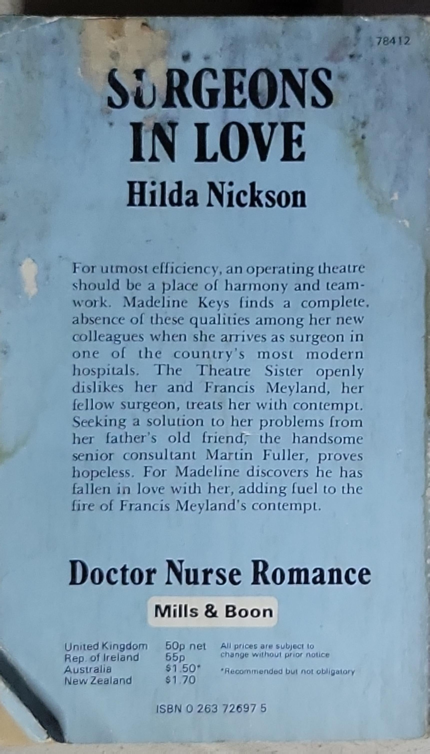 Back cover describes a tale of Madeline Keys, a new surgeon whose arrival at a country hospital unsettles colleagues, including The Theatre Sister and Francis Meyland. The handsome senior consultant Martin Fuller becomes entangled with Madeline as she confronts professional and romantic challenges. The narrative centers on love and professional tensions in a hospital setting. ISBN 0-263-72697-5.