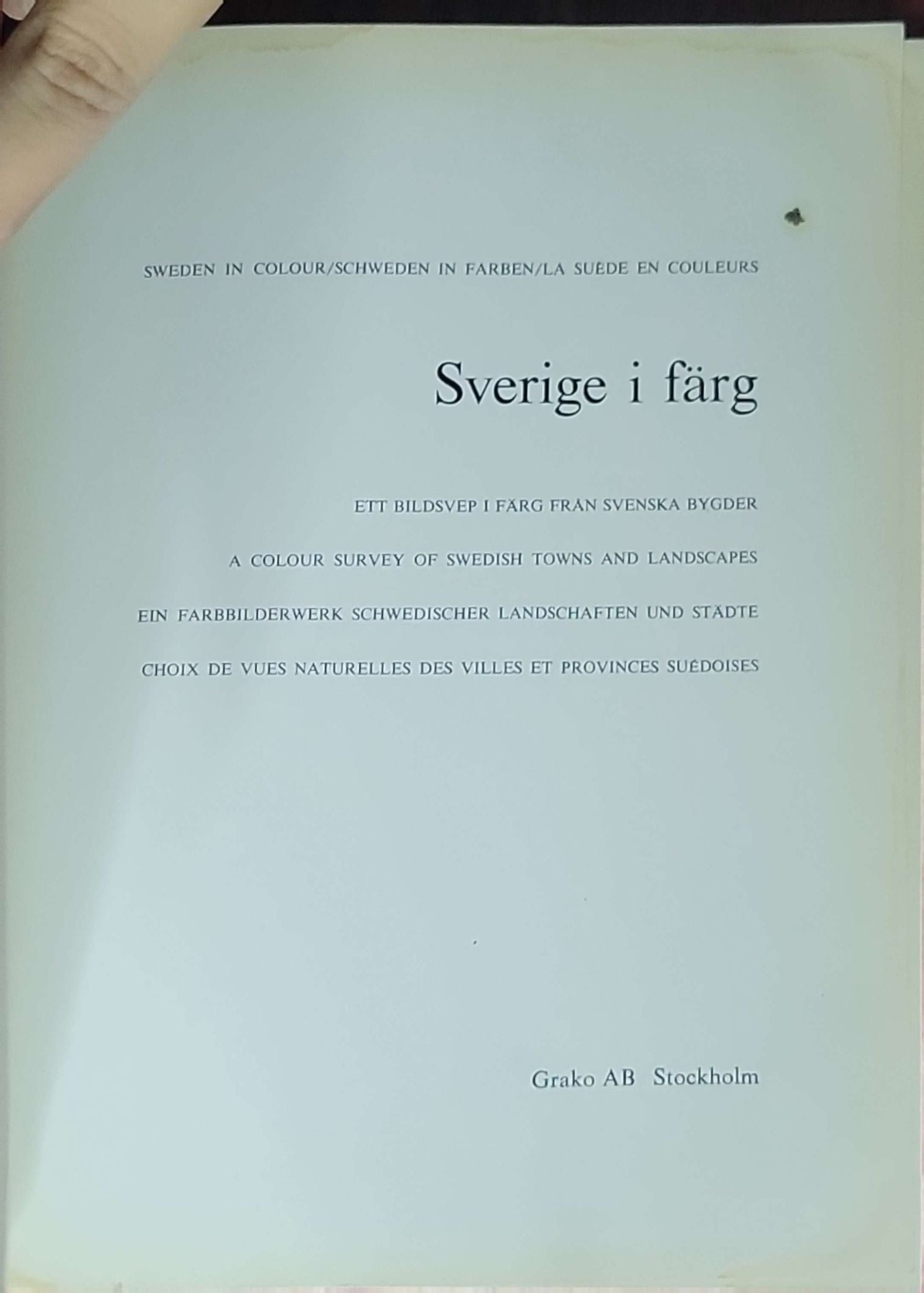 A large-format, multi-language photo-book portraying Swedish towns and landscapes. The book was published by Grako AB (Grafisk Konst) in Stockholm. Text is presented in Swedish, English, German and French.