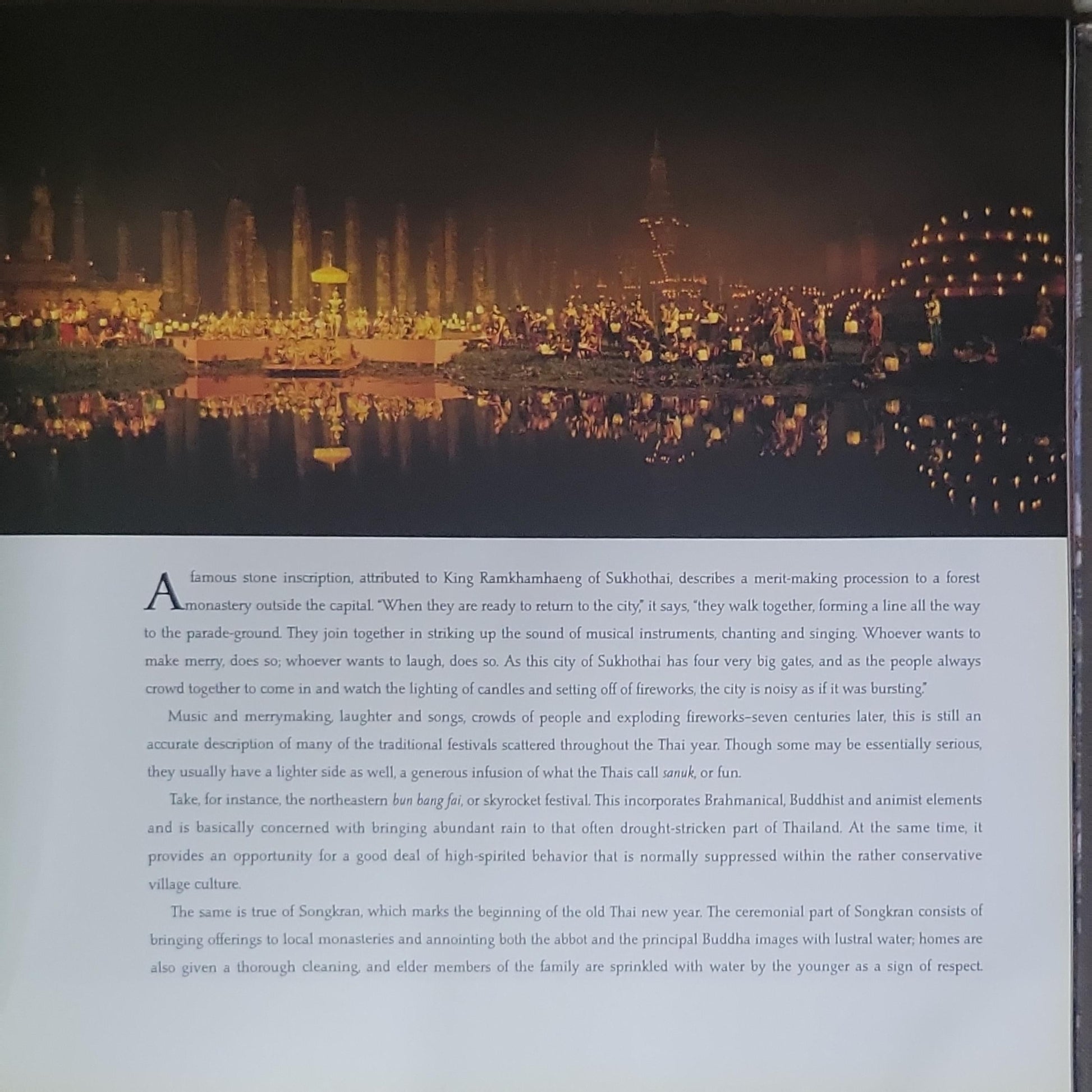 Thailand: The Golden Kingdom is a 96-page hardcover travel pictorial guide featuring vivid photography and commentary on Thai life, culture, festivals, art, architecture, and traditions. It presents an overview of history, geography, and cultural heritage, with sections on festivals and collectibles and a focus on Thai arts and crafts.