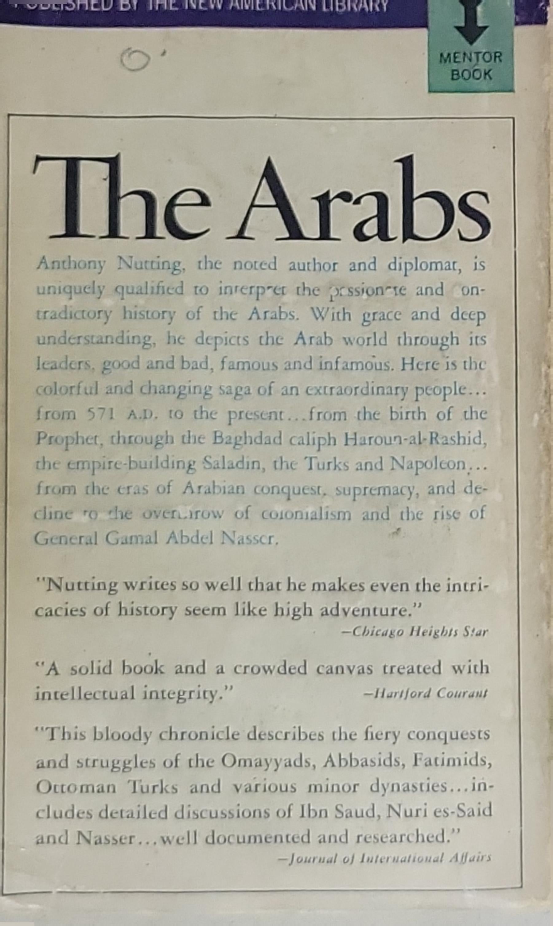 A narrative history of the Arab world from the birth of Mohammed to the rise of Gamal Abdel Nasser, written by Anthony Nutting. It presents the political and dynastic developments of the Arab world through its leaders and empires, as recorded in Nutting's accessible chronicle.