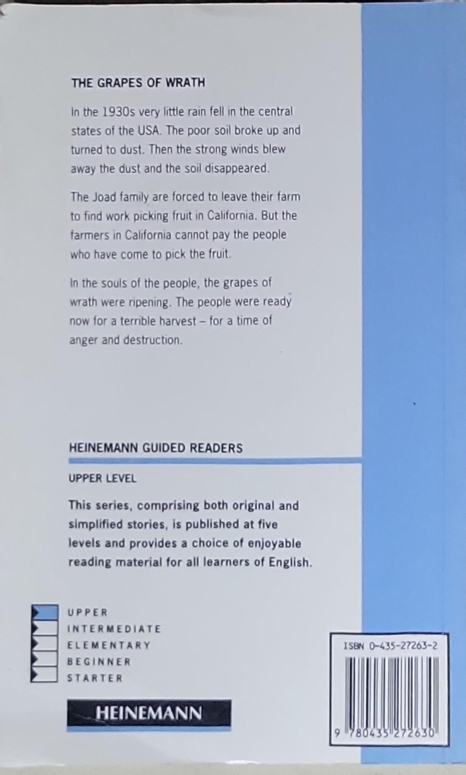 In the 1930s very little rain fell in the central states of the USA. The poor soil broke up and turned to dust. Then the strong winds blew away the dust and the soil disappeared. The Joad family are forced to leave their farm to find work picking fruit in California. But the farmers in California cannot pay the people who have come to pick the fruit. In the souls of the people, the grapes of wrath were ripening. The people were ready now for a terrible harvest – for a time of anger and destruction.