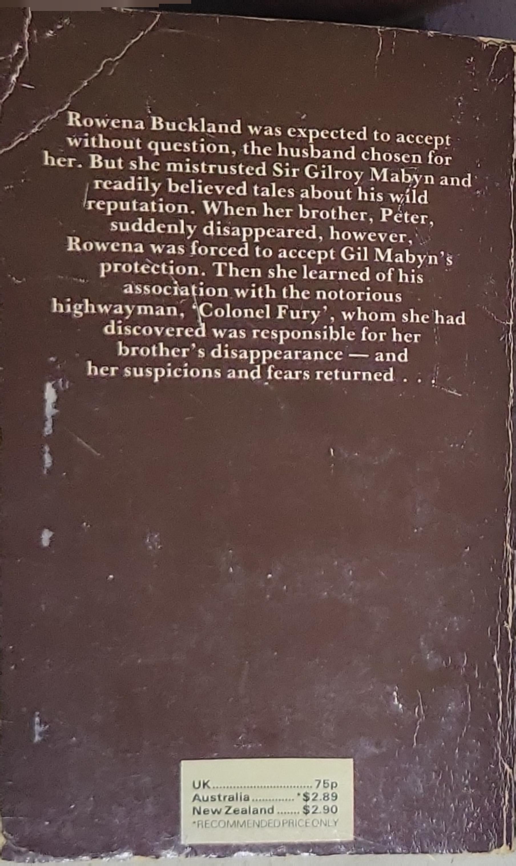A historical romance involving Rowena Buckland and her suspicions about a notorious highwayman, with themes of trust, betrayal, and peril surrounding a disappearance and a dangerous protector.