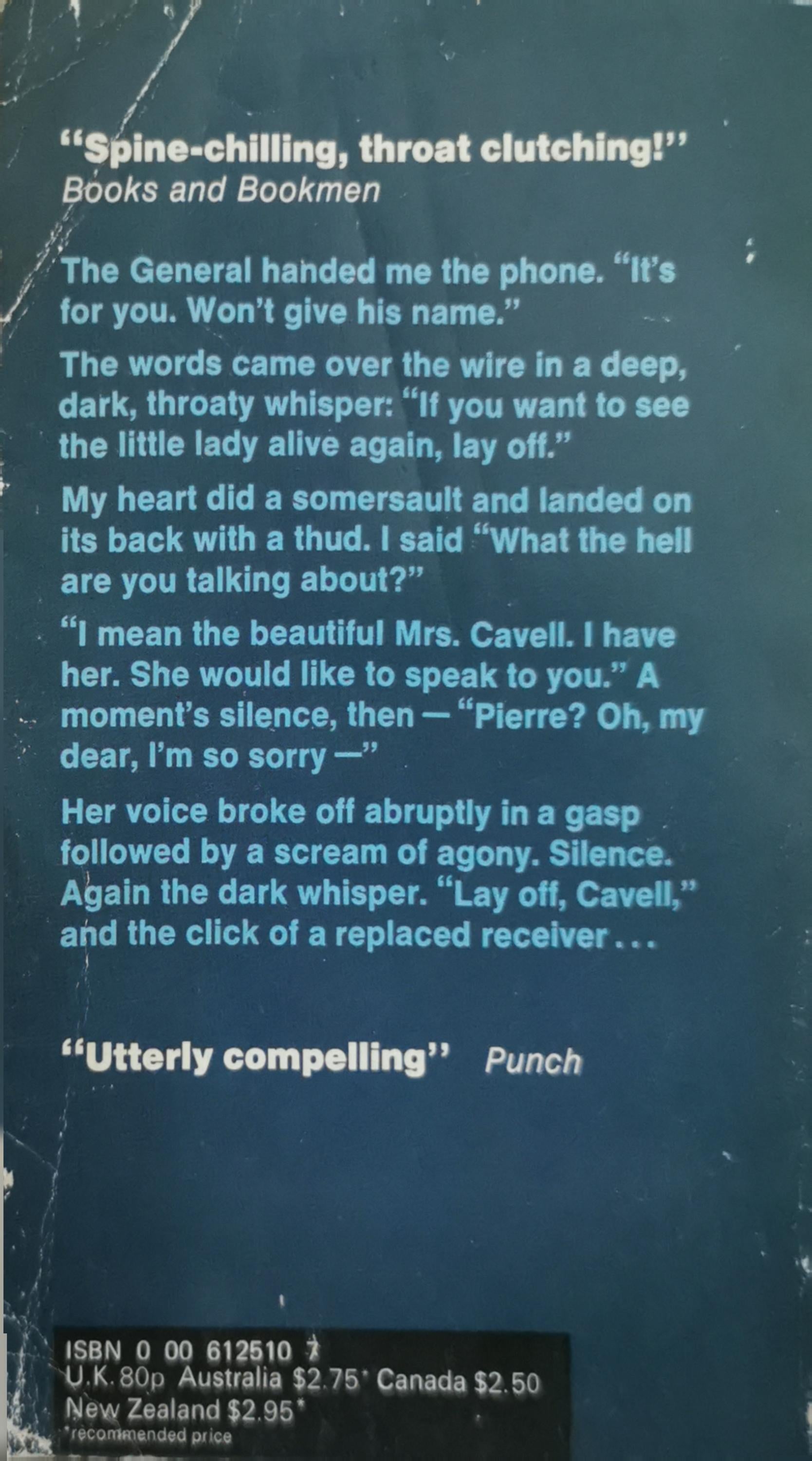 Her voice broke off abruptly in a gasp followed by a scream of agony. Silence. Again the dark whisper. “Lay off, Cavell”, and the click of a replaced receiver…